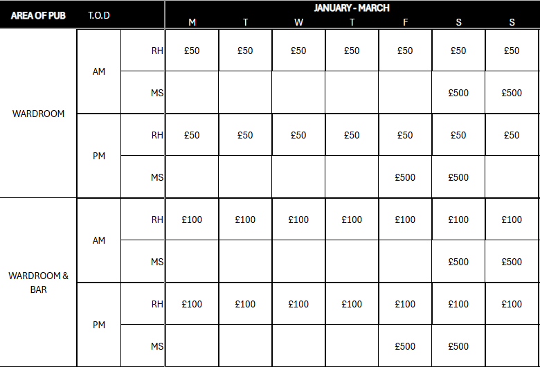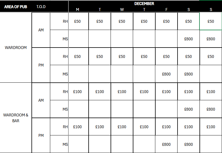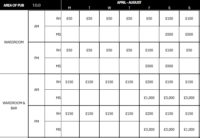 AM RH + PM RH = All Day Room Hire // AM MS + PM MS = All Day Minimum Spend.