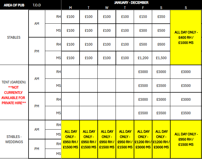 AM RH + PM RH = All Day Room Hire // AM MS + PM MS = All Day Minimum Spend.
